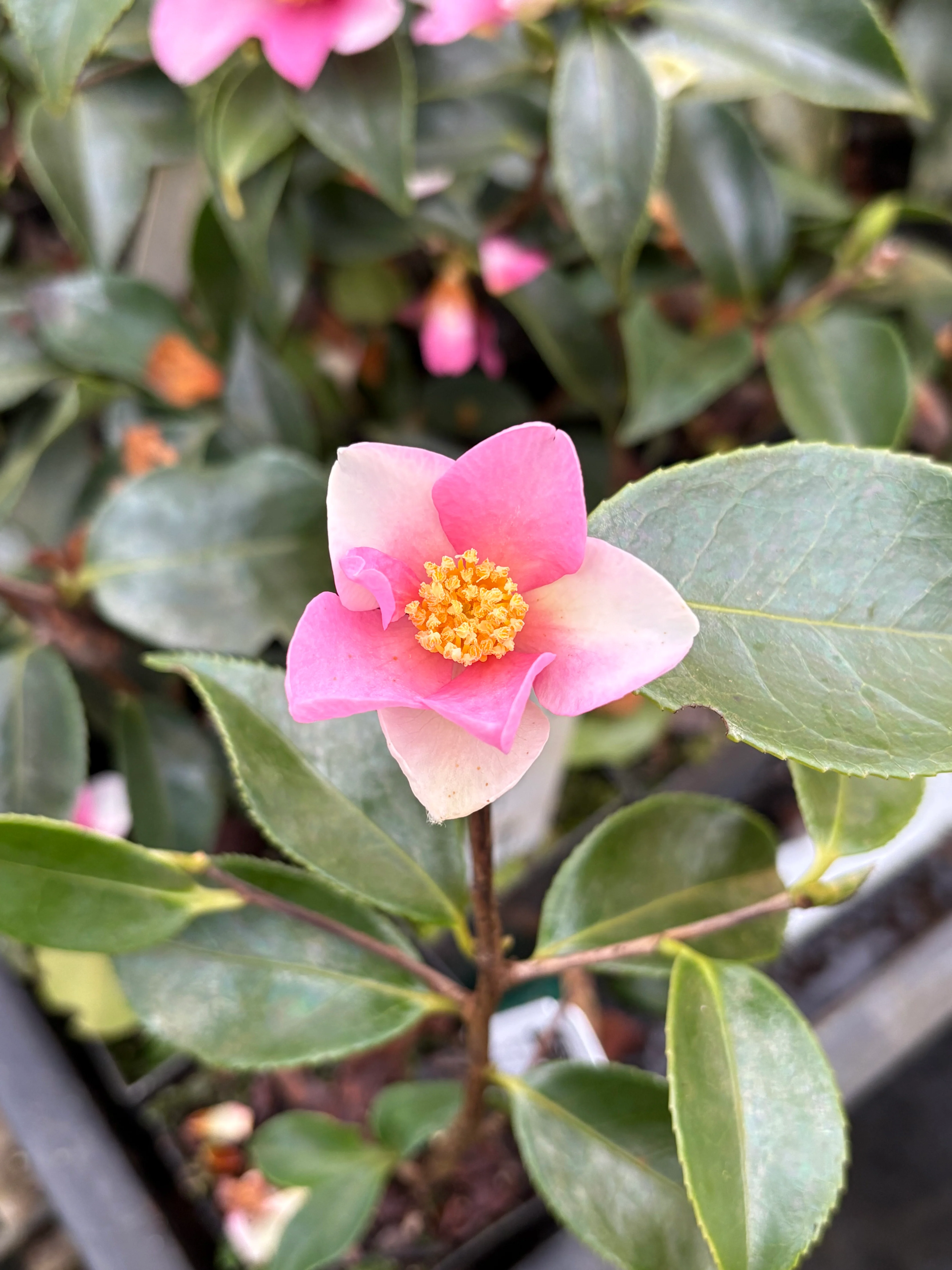 Translating as “Dream”, this unique hybrid bears lovely single 3" flowers of alternating pink and white petals from fall through spring, with a sweet fragrance coming from the C. yuhsienensis parentage. A moderate grower, with a loose, open form to 10' tall and wide in time. Sets seed freely, so may be useful in hybridization efforts. Prefers part shade inland, with moderate water in well-drained, acid soil. USDA zone 8, possibly lower.