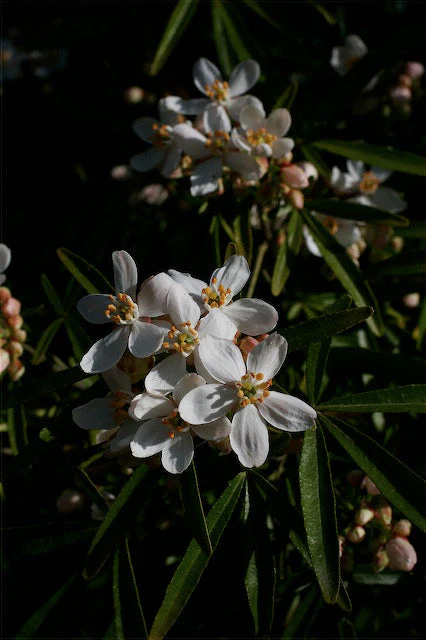 Wonderful, medium-sized, evergreen shrub, a cross between dryland species, C. ternata and C. arizonica, with handsome, narrow leaves and abundant, fragrant, white, orange-blossom-scented flowers in spring and summer. To 3-5 ft tall and wide, a useful and tough evergreen shrub for full sun to part shade, fertile, well- drained soil, and occasional summer water at least to establish. Frost hardy to 10F, USDA zone 8. Also found as Choisya x dewitteana 'Aztec Pearl'.