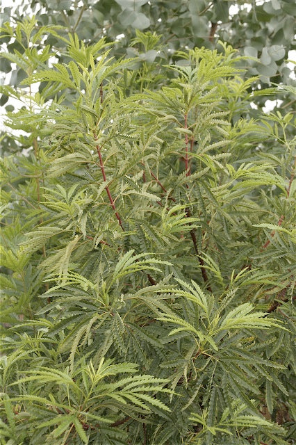 Lacy, evergreen foliage and cool, honey-brown peeling bark set this California native apart. A large shrub or small tree, to 15 ft, with an upright habit. Sorbus-like domed clusters of tiny white flowers in early summer. Best in full sun, with little summer water once established. Cold hardy and evergreen to 10 to 15F, USDA zone 8a. Cold drying winds can cause temporary defoliation in the low end of its hardiness.